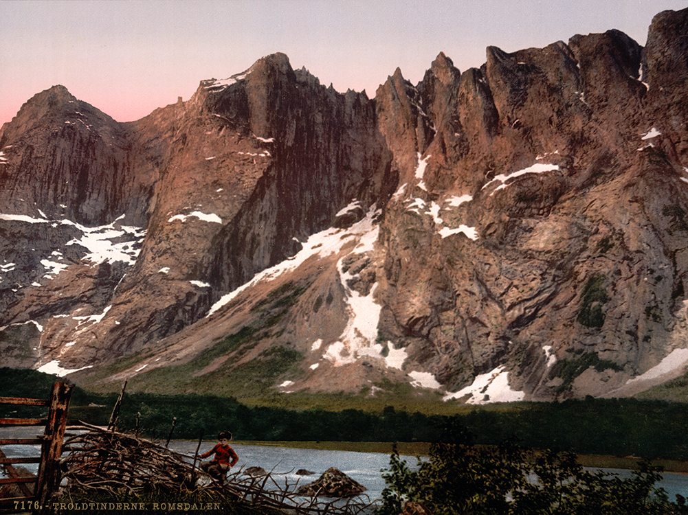 Historisk kunsttrykk av Trolltindene på slutten av 1800-tallet. Et fjellparti med nasjonal stolthet og romantisk beundring.